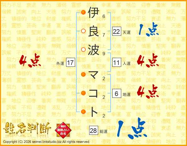 伊(6画)良(7画)波(9画) マ(2画)コ(2画)ト(2画)