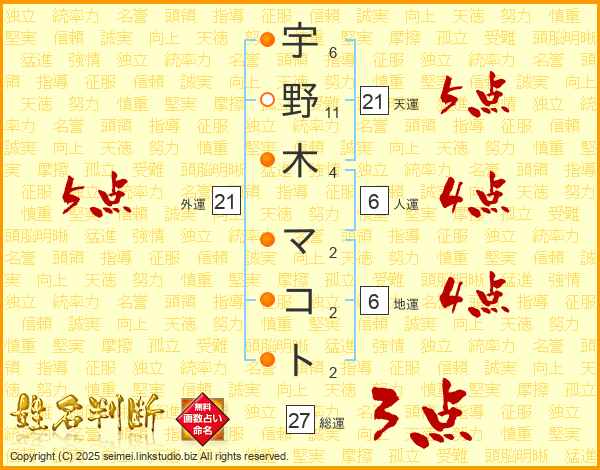 宇(6画)野(11画)木(4画) マ(2画)コ(2画)ト(2画)