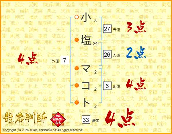 小(3画)塩(24画) マ(2画)コ(2画)ト(2画)