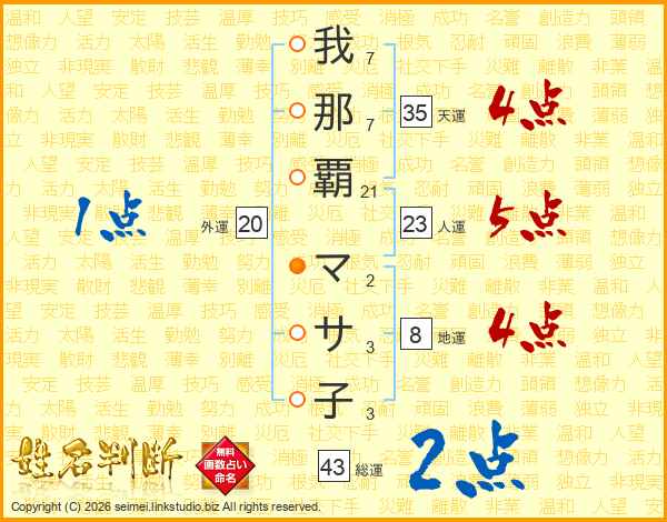 我那覇マサ子さんの総運は43画の2点!