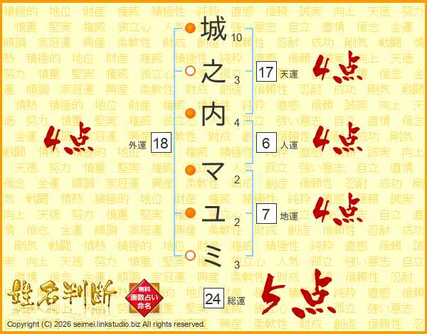 城(10画)之(3画)内(4画) マ(2画)ユ(2画)ミ(3画)