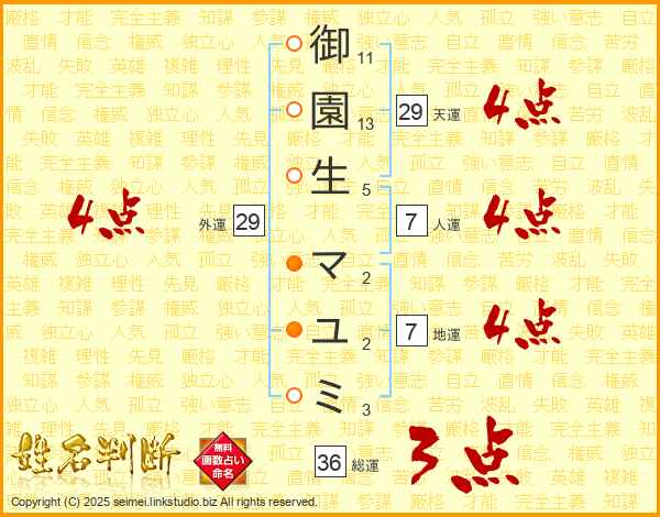 御(11画)園(13画)生(5画) マ(2画)ユ(2画)ミ(3画)