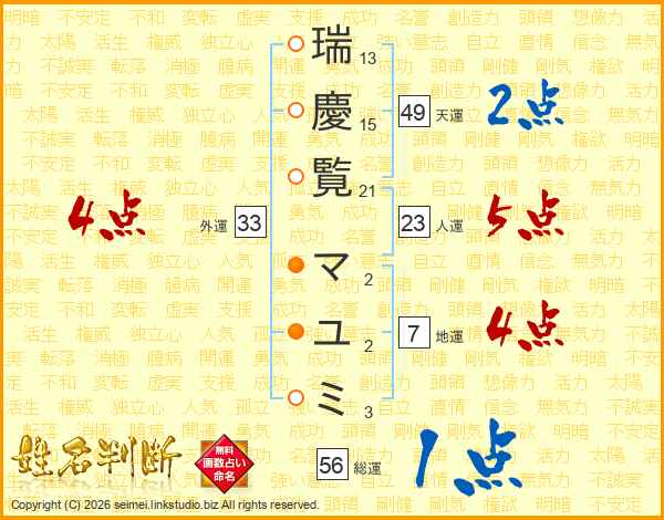 瑞(13画)慶(15画)覧(21画) マ(2画)ユ(2画)ミ(3画)