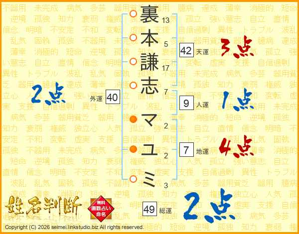 裏本謙志マユミさんの総運は49画の2点!