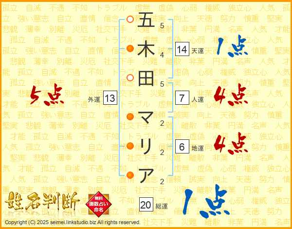 生活面を象徴する運勢です。外部から受ける影響力を表し、結婚運、家庭運や職場、環境への順応性を表します。総運から人運を引いた画数。姓や名が1文字の場合を除く。