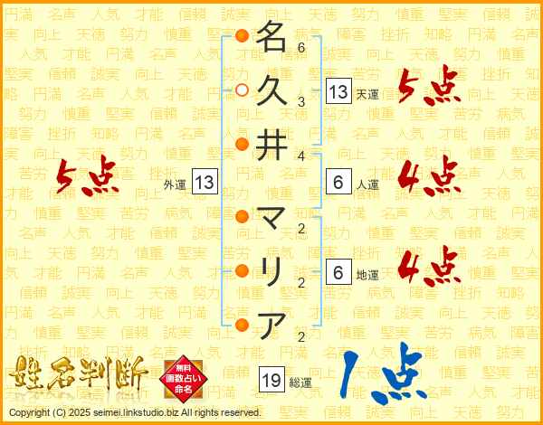 名(6画)久(3画)井(4画) マ(2画)リ(2画)ア(2画)