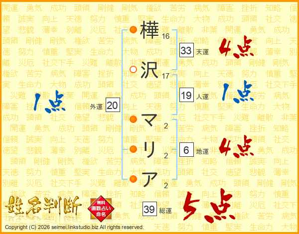 樺沢マリアさんの総運は39画の5点!
