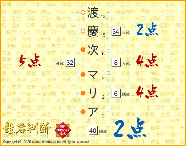 生活面を象徴する運勢です。外部から受ける影響力を表し、結婚運、家庭運や職場、環境への順応性を表します。総運から人運を引いた画数。姓や名が1文字の場合を除く。