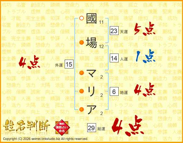 生活面を象徴する運勢です。外部から受ける影響力を表し、結婚運、家庭運や職場、環境への順応性を表します。総運から人運を引いた画数。姓や名が1文字の場合を除く。