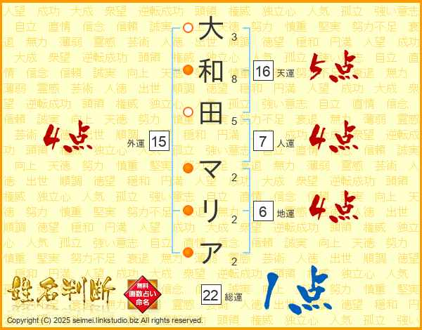 生活面を象徴する運勢です。外部から受ける影響力を表し、結婚運、家庭運や職場、環境への順応性を表します。総運から人運を引いた画数。姓や名が1文字の場合を除く。