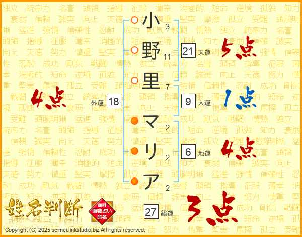 小(3画)野(11画)里(7画) マ(2画)リ(2画)ア(2画)