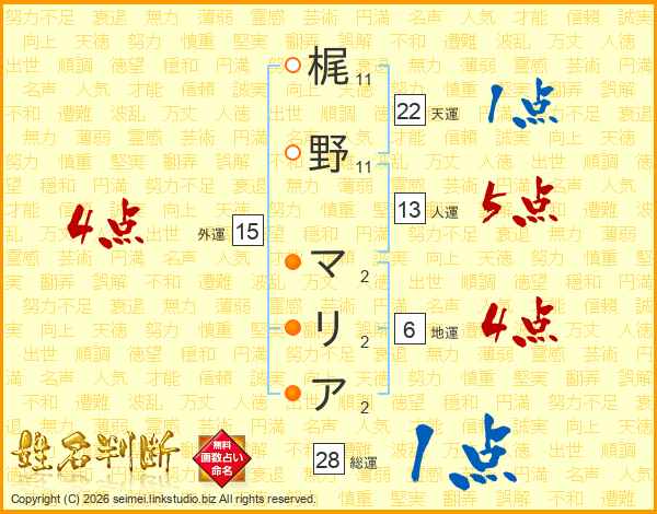 梶(11画)野(11画) マ(2画)リ(2画)ア(2画)