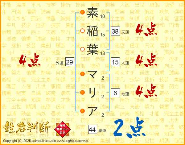 素(10画)稲(15画)葉(13画) マ(2画)リ(2画)ア(2画)