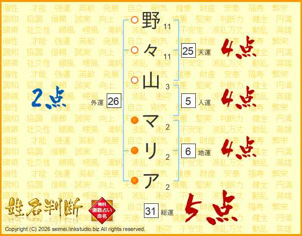生活面を象徴する運勢です。外部から受ける影響力を表し、結婚運、家庭運や職場、環境への順応性を表します。総運から人運を引いた画数。姓や名が1文字の場合を除く。