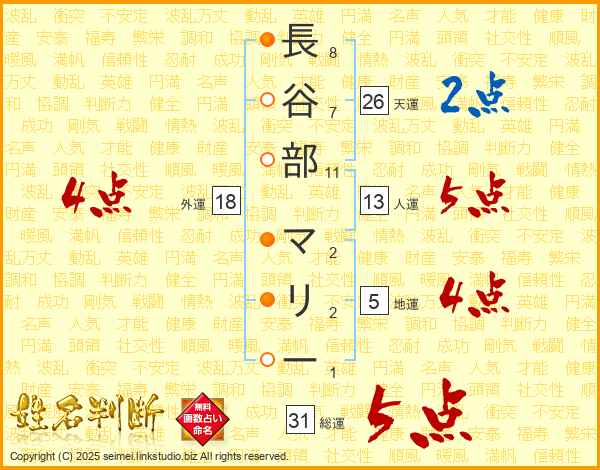 あなたの人生を表す1番重要な運勢です。生涯を通じて影響する総合運となり、主に50歳以降の晩年期に影響を及ぼします。苗字と名前の合計画数。
