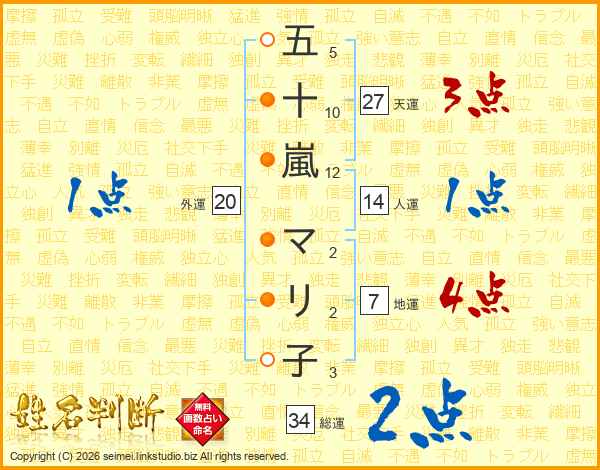 五十嵐マリ子さんの総運は34画の2点!