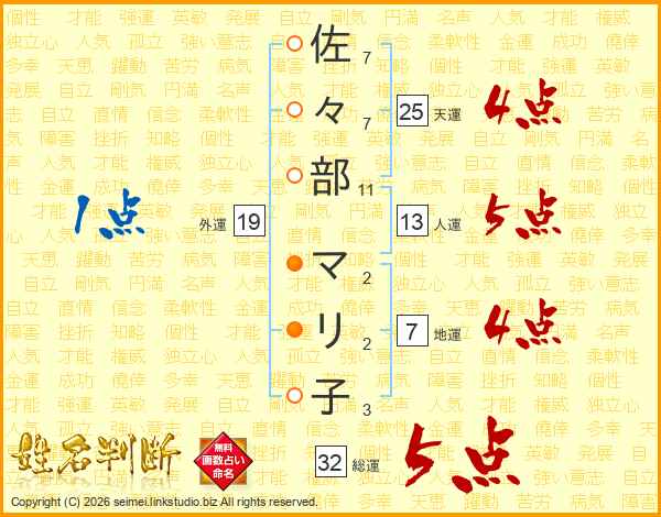 佐(7画)々(7画)部(11画) マ(2画)リ(2画)子(3画)