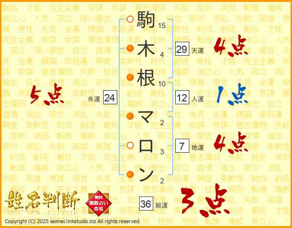 駒(15画)木(4画)根(10画) マ(2画)ロ(3画)ン(2画)