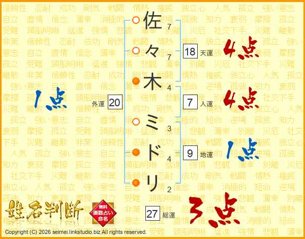 佐(7画)々(7画)木(4画) ミ(3画)ド(4画)リ(2画)