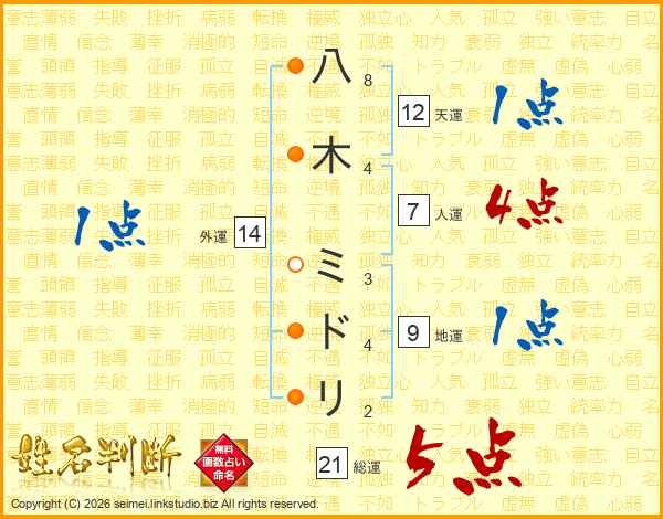 生活面を象徴する運勢です。外部から受ける影響力を表し、結婚運、家庭運や職場、環境への順応性を表します。総運から人運を引いた画数。姓や名が1文字の場合を除く。
