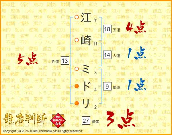 江(7画)崎(11画) ミ(3画)ド(4画)リ(2画)