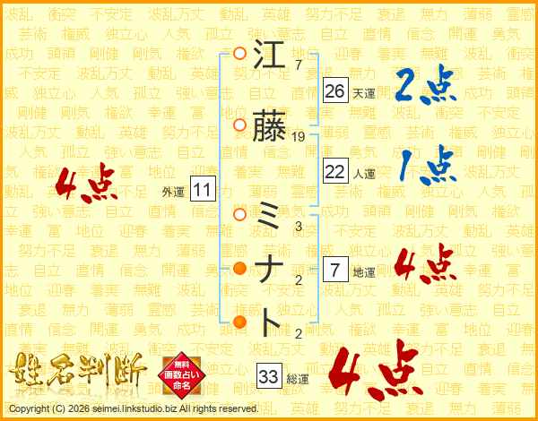 江(7画)藤(19画) ミ(3画)ナ(2画)ト(2画)