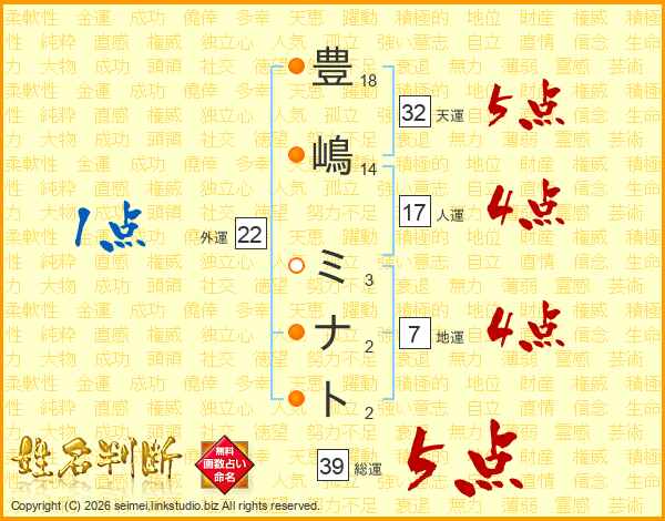 豊嶋ミナトさんの総運は39画の5点!