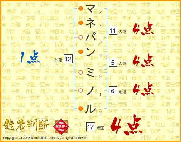 マ(2画)ネ(4画)パ(3画)ン(2画) ミ(3画)ノ(1画)ル(2画)