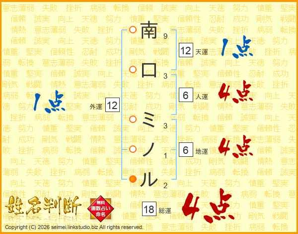 南(9画)口(3画) ミ(3画)ノ(1画)ル(2画)