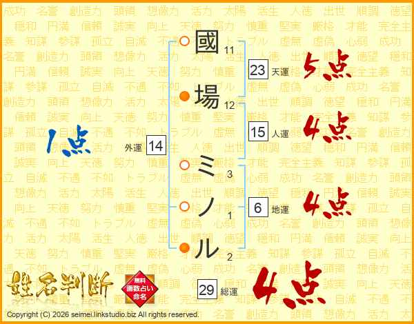 國(11画)場(12画) ミ(3画)ノ(1画)ル(2画)