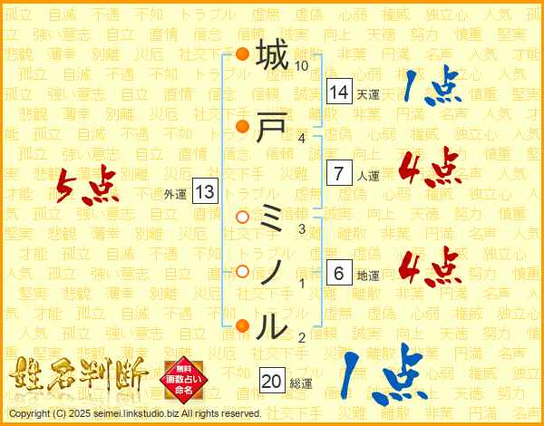 生活面を象徴する運勢です。外部から受ける影響力を表し、結婚運、家庭運や職場、環境への順応性を表します。総運から人運を引いた画数。姓や名が1文字の場合を除く。