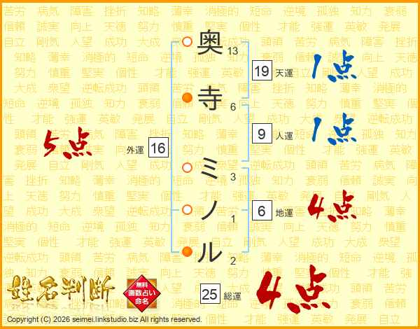 奥寺ミノルさんの総運は25画の4点!