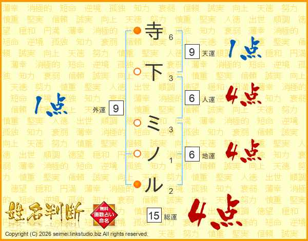 生活面を象徴する運勢です。外部から受ける影響力を表し、結婚運、家庭運や職場、環境への順応性を表します。総運から人運を引いた画数。姓や名が1文字の場合を除く。