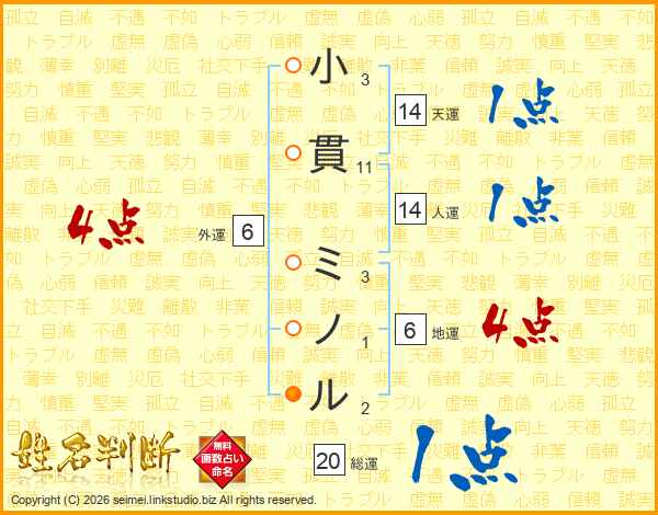 小(3画)貫(11画) ミ(3画)ノ(1画)ル(2画)