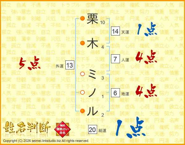 生活面を象徴する運勢です。外部から受ける影響力を表し、結婚運、家庭運や職場、環境への順応性を表します。総運から人運を引いた画数。姓や名が1文字の場合を除く。