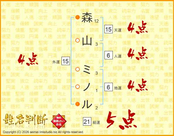 生活面を象徴する運勢です。外部から受ける影響力を表し、結婚運、家庭運や職場、環境への順応性を表します。総運から人運を引いた画数。姓や名が1文字の場合を除く。