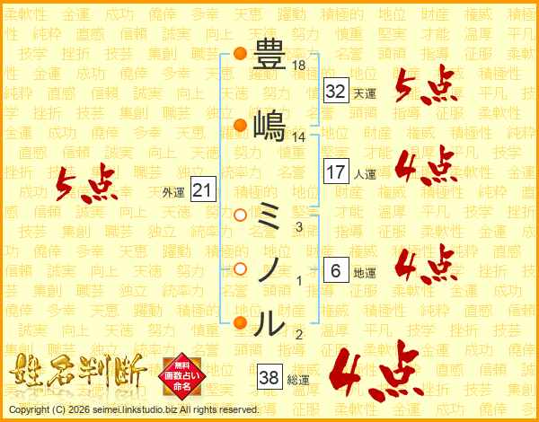 豊嶋ミノルさんの総運は38画の4点!