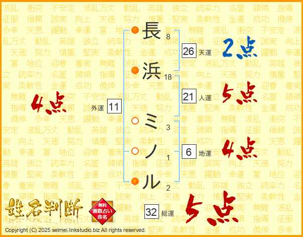 あなたの人生を表す1番重要な運勢です。生涯を通じて影響する総合運となり、主に50歳以降の晩年期に影響を及ぼします。苗字と名前の合計画数。