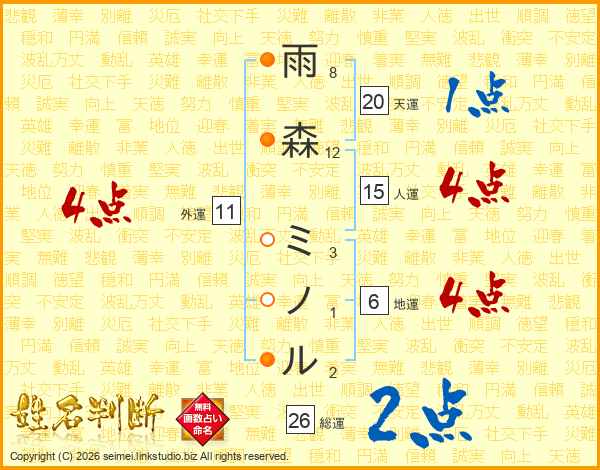 雨森ミノルさんの総運は26画の2点!