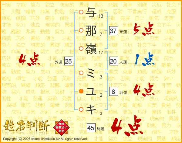与(13画)那(7画)嶺(17画) ミ(3画)ユ(2画)キ(3画)