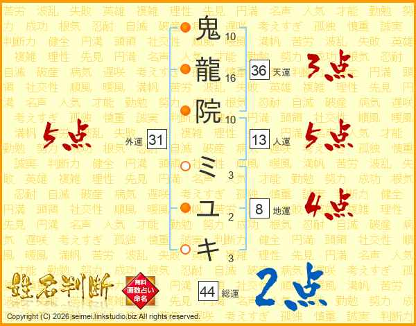 鬼龍院ミユキさんの天運は36画の3点!
