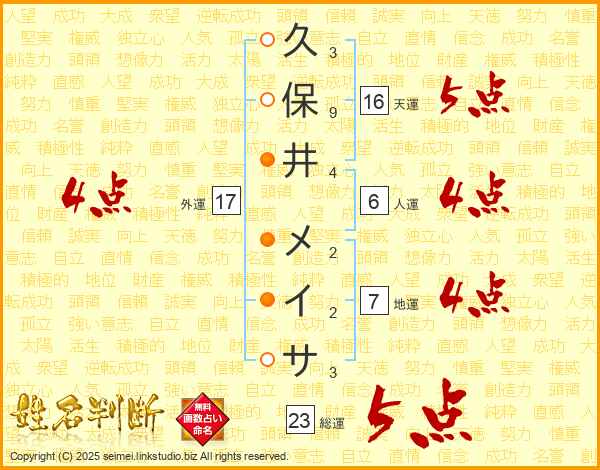 生活面を象徴する運勢です。外部から受ける影響力を表し、結婚運、家庭運や職場、環境への順応性を表します。総運から人運を引いた画数。姓や名が1文字の場合を除く。