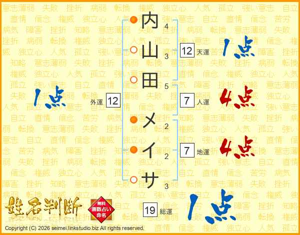 生活面を象徴する運勢です。外部から受ける影響力を表し、結婚運、家庭運や職場、環境への順応性を表します。総運から人運を引いた画数。姓や名が1文字の場合を除く。