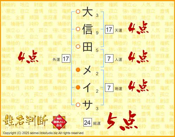 大(3画)信(9画)田(5画) メ(2画)イ(2画)サ(3画)