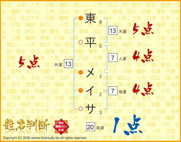 生活面を象徴する運勢です。外部から受ける影響力を表し、結婚運、家庭運や職場、環境への順応性を表します。総運から人運を引いた画数。姓や名が1文字の場合を除く。