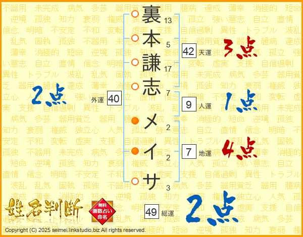 裏(13画)本(5画)謙(17画)志(7画) メ(2画)イ(2画)サ(3画)