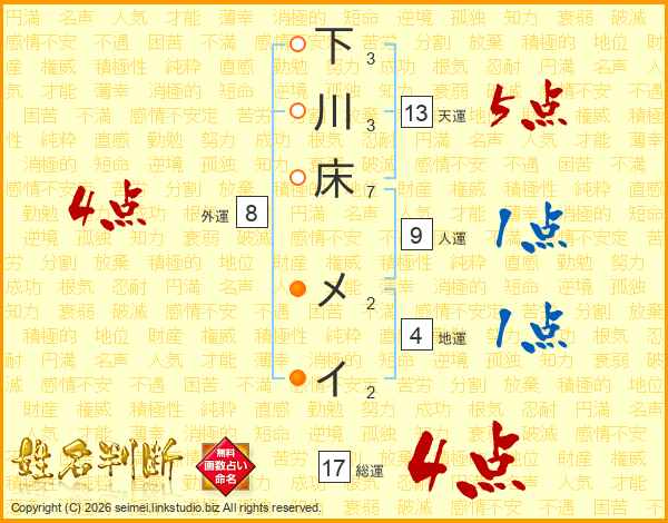 生活面を象徴する運勢です。外部から受ける影響力を表し、結婚運、家庭運や職場、環境への順応性を表します。総運から人運を引いた画数。姓や名が1文字の場合を除く。