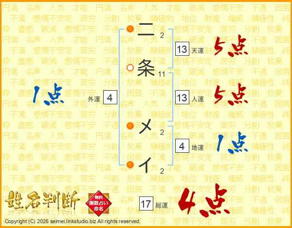 二条メイさんの人運は13画の5点!