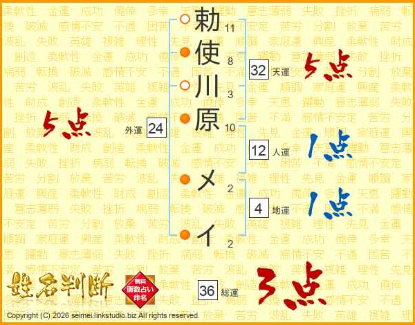 生活面を象徴する運勢です。外部から受ける影響力を表し、結婚運、家庭運や職場、環境への順応性を表します。総運から人運を引いた画数。姓や名が1文字の場合を除く。
