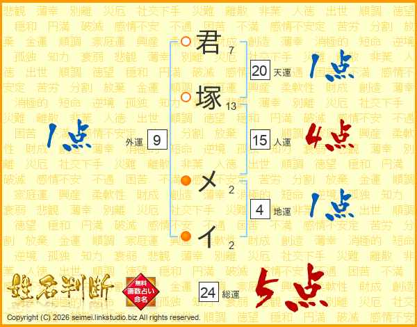 生活面を象徴する運勢です。外部から受ける影響力を表し、結婚運、家庭運や職場、環境への順応性を表します。総運から人運を引いた画数。姓や名が1文字の場合を除く。